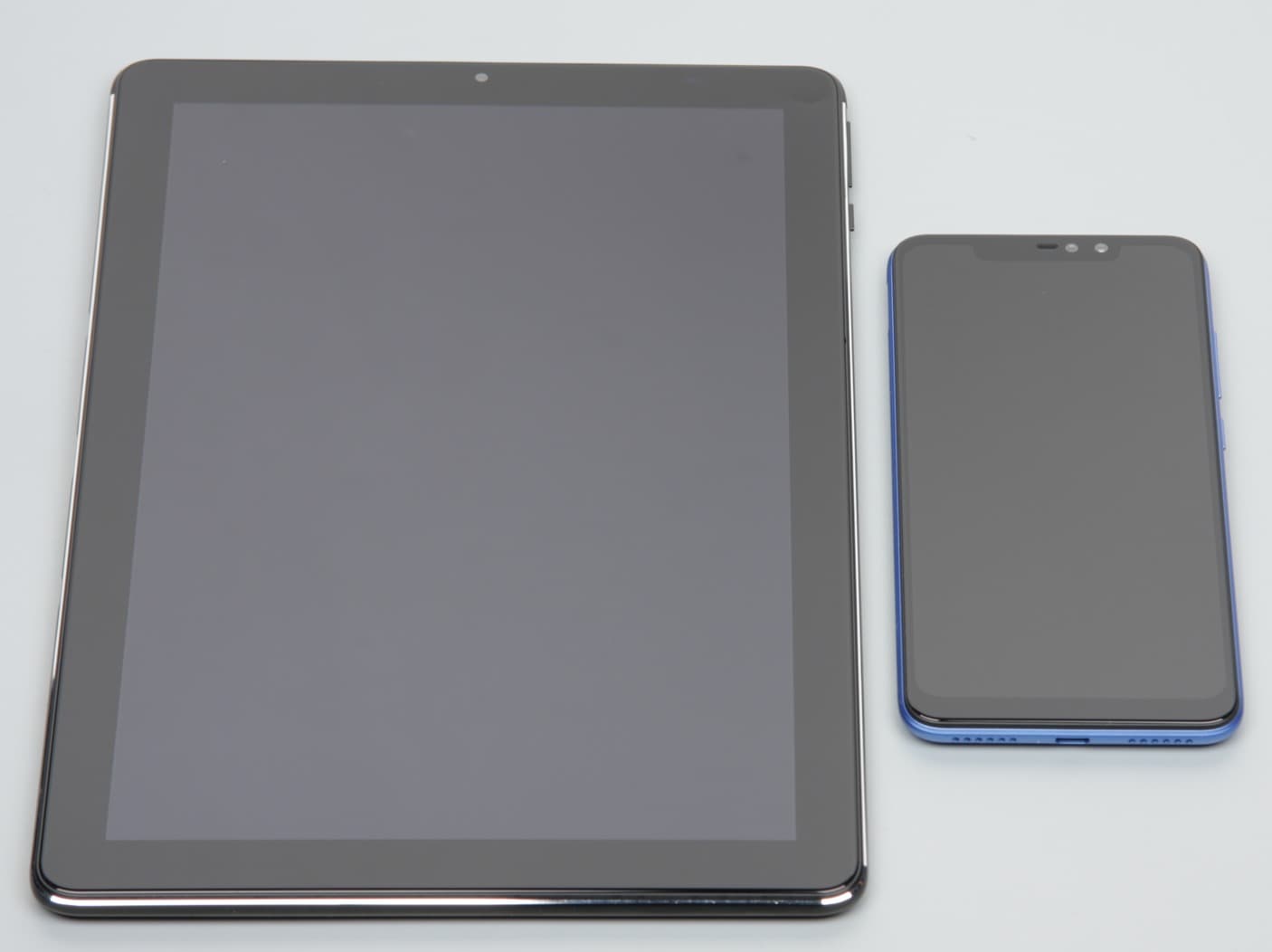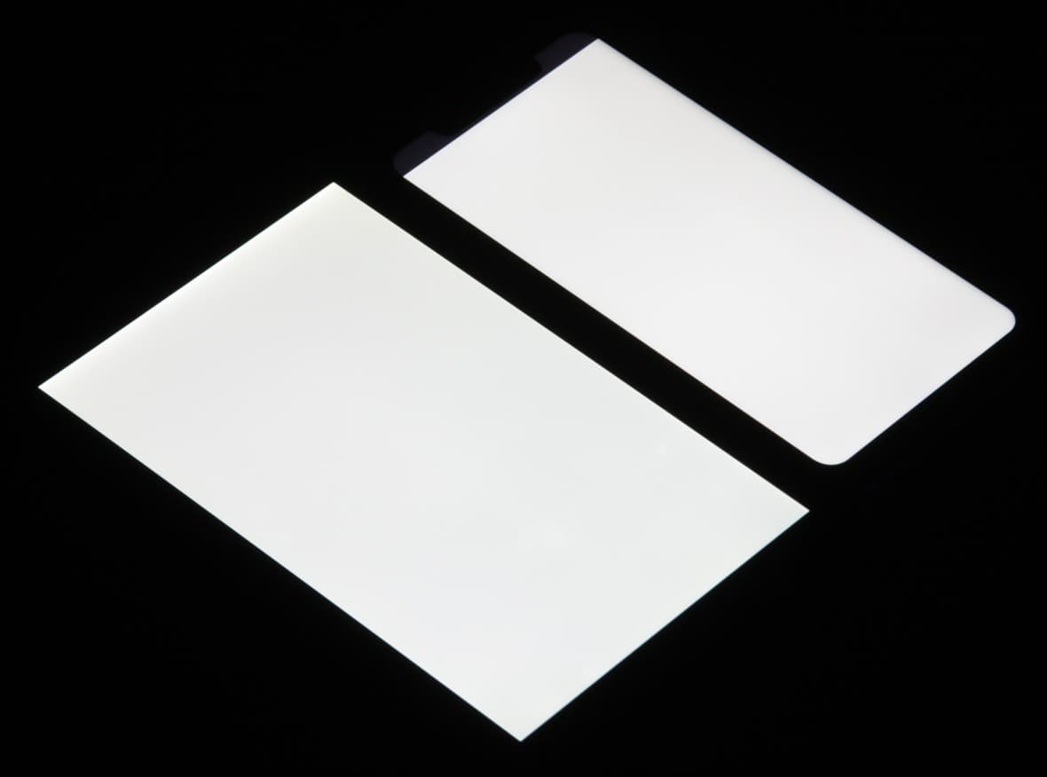 Лицевая поверхность экрана выполнена в виде стеклянной пластины с зеркально-гладкой поверхностью, устойчивой к появлению царапин. Судя по отражению объектов, антибликовые свойства экрана лучше, чем у экрана планшета Chuwi Hi9 plus. Для наглядности приведем фотографию, на которой в выключенных экранах отражается белая поверхность (слева — Chuwi Hi9 plus, справа — Xiaomi Redmi Note 6 Pro, далее их можно различать по размеру):