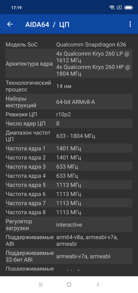 - SoC Qualcomm Snapdragon 636, 8 ядер Kryo 260 @1,8 ГГц