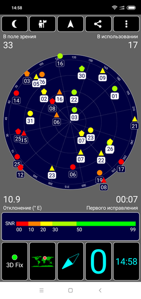 Навигационный модуль работает с GPS (с A-GPS) и с отечественной Глонасс. Насчет поддержки китайской Beidou в спецификациях сведения имеются, но тестовая программа на практике этих спутников не находит. Первые спутники при холодном старте обнаруживаются довольно быстро, в течение первой минуты. Магнитный компас, необходимый для работы навигационных программ, в аппарате имеется.
