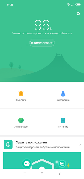 Интерфейс MIUI, как обычно, отличается максимальным количеством настроек, есть поддержка жестов, можно уменьшать рабочую площадь экрана, переназначать кнопки, управлять работой светового индикатора, а также многое другое. Знакомый с интерфейсом MIUI легко со всем разберется, но для большинства обычных пользователей такие возможности, конечно, избыточны. Из предустановленных программ можно выделить комплексный менеджер телефона, отвечающий за энергопотребление, мониторинг системы, защиту от вирусов, очистку памяти и т. д. В общем же, программ установлено много, но большинство из них — полезные утилиты, так что претензий никаких.