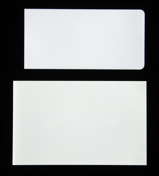 Яркость под углом у экранов уменьшилась (как минимум в 5 раз, исходя из разницы в выдержке), и уменьшилась примерно одинаково. Черное поле при отклонении по диагонали сильно высветляется и приобретает красно-фиолетовый оттенок. Фотографии ниже это демонстрируют (яркость белых участков в перпендикулярном плоскости экранов направлении одинаковая!):