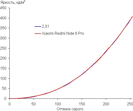 Контрастность (примерно в центре экрана) высокая — порядка 1500:1. Время отклика при переходе черный-белый-черный равно 18 мс (10 мс вкл. + 8 мс выкл.). Переход между полутонами серого 25% и 75% (по численному значению цвета) и обратно в сумме занимает 34 мс. Построенная по 32 точкам с равным интервалом по численному значению оттенка серого гамма-кривая не выявила завала ни в светах, ни в тенях. Показатель аппроксимирующей степенной функции равен 2,31, что немного выше стандартного значения 2,2. При этом реальная гамма-кривая почти не отклоняется от степенной зависимости: