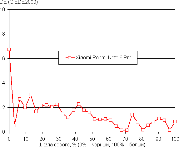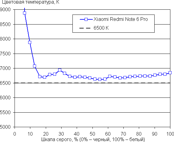 Результат в последнем случае хороший (см. графики ниже), поскольку цветовая температура становится несильно выше стандартных 6500 К, а отклонение от спектра абсолютно черного тела (ΔE) ниже 10, что для потребительского устройства считается неплохим показателем. При этом цветовая температура и ΔE мало изменяются от оттенка к оттенку — это положительно сказывается на визуальной оценке цветового баланса. (Самые темные области шкалы серого можно не учитывать, так как там баланс цветов не имеет большого значения, да и погрешность измерений цветовых характеристик на низкой яркости большая.)