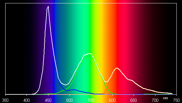 При этом горбы зеленого и красного цветов относительно хорошо разделены, что и приводит к некоторому уширению цветового охвата.
