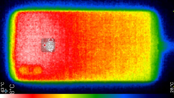 Нагрев локализован в верхней части аппарата, что, видимо, соответствует расположению микросхемы SoC. По данным теплокамеры, максимальный нагрев составил 43 градуса (при температуре окружающего воздуха в 24 градуса), это несколько выше среднего значения в данном тесте для современных смартфонов.