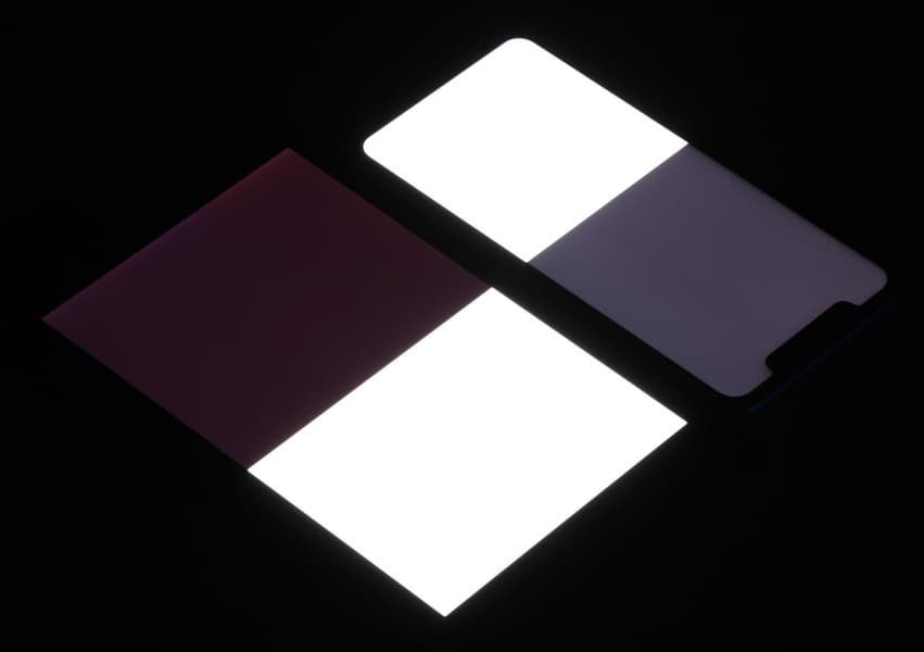 Экран у Xiaomi Redmi Note 6 Pro темнее (яркость по фотографиям 115 против 122 у Chuwi Hi9 plus). Двоение отраженных объектов в экране Xiaomi Redmi Note 6 Pro очень слабое, это свидетельствует о том, что между слоями экрана (конкретнее между внешним стеклом и поверхностью ЖК-матрицы) нет воздушного промежутка (экран типа OGS — One Glass Solution). За счет меньшего числа границ (типа стекло/воздух) с сильно различающимися коэффициентами преломления такие экраны лучше смотрятся в условиях интенсивной внешней засветки, но вот их ремонт в случае потрескавшегося внешнего стекла обходится гораздо дороже, так как менять приходится экран целиком. На внешней поверхности экрана есть специальное олеофобное (жироотталкивающее) покрытие (по эффективности заметно лучше, чем у Nexus 7), поэтому следы от пальцев удаляются значительно легче, а появляются с меньшей скоростью, чем в случае обычного стекла.