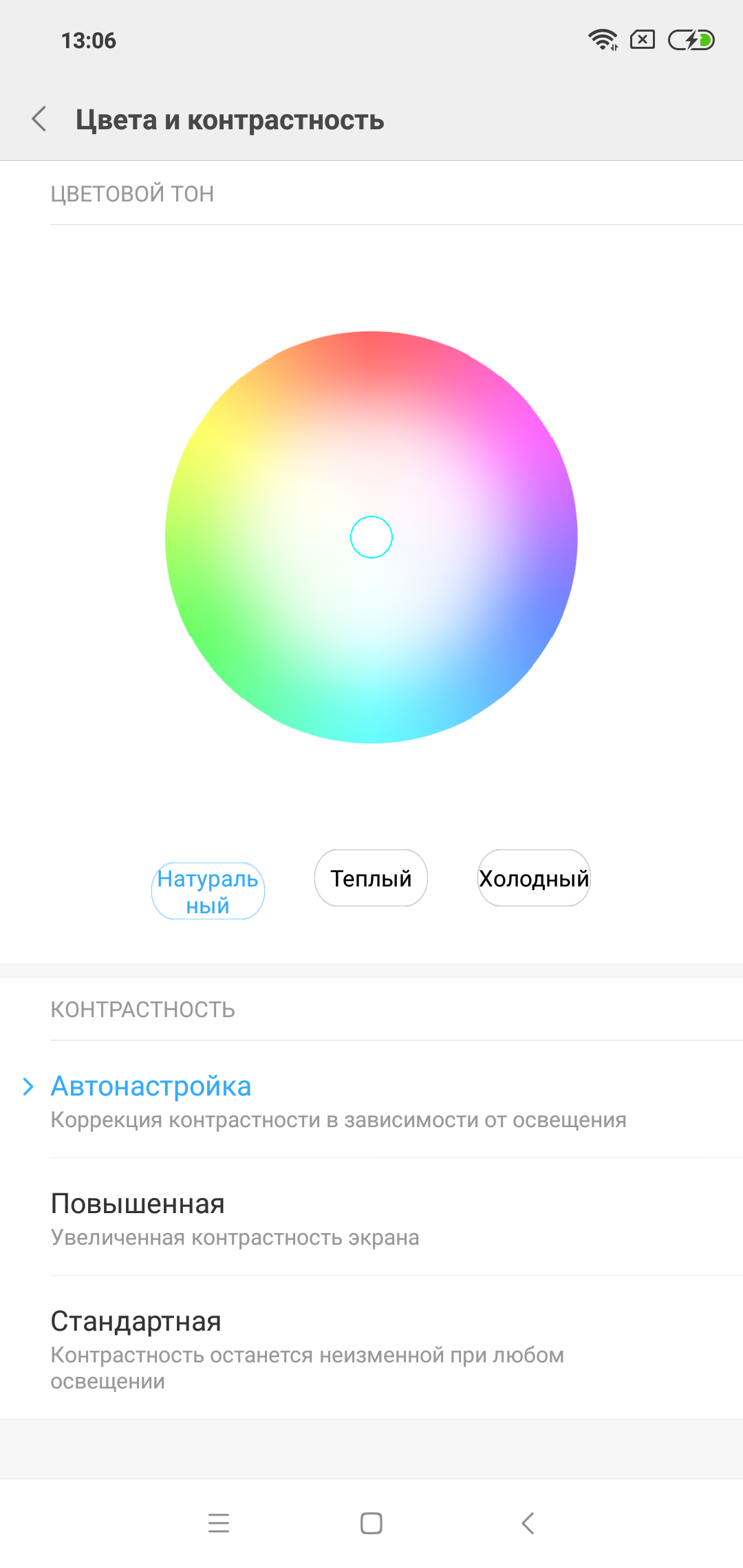 По умолчанию цветовая температура высоковата, порядка 8800 К. Однако в этом устройстве при выборе профиля Автонастройка есть возможность скорректировать цветовой баланс с помощью регулировки оттенка точкой на цветовом круге или выбирая предустановленные варианты. Кроме того, коррекция выполняется автоматически при выборе профиля Стандартная.