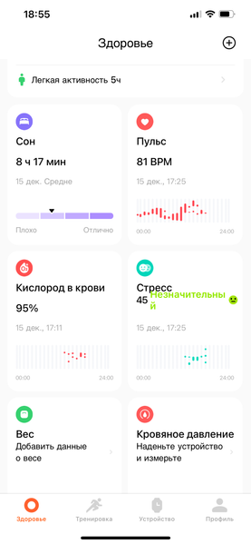 Для работы с часами надо установить приложение Mi Fitness, хорошо нам знакомое. Вся информация здесь рассортирована по четырем разделам: «Здоровье», «Тренировка», «Устройство» и «Профиль». Из них в повседневности нужно в основном первое, тренировки же удобнее запускать с самого браслета.