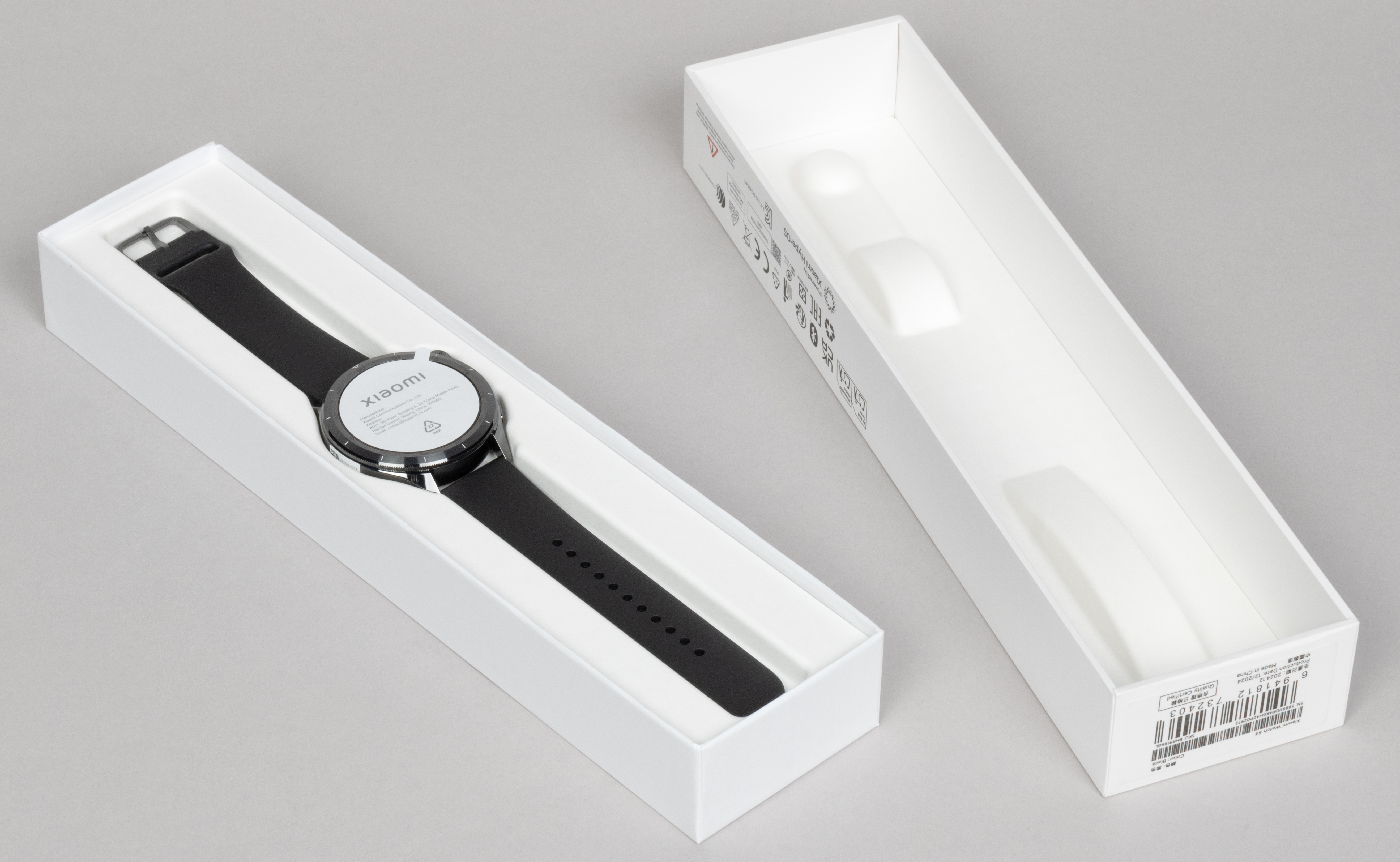 Модель Xiaomi Watch S4 поставляется в вытянутой коробке из плотного картона — достаточно объемной, хотя ничего особенного внутри нет. Представляется, что можно было сделать ее компактнее. Но, впрочем, само устройство она защищает надежно.