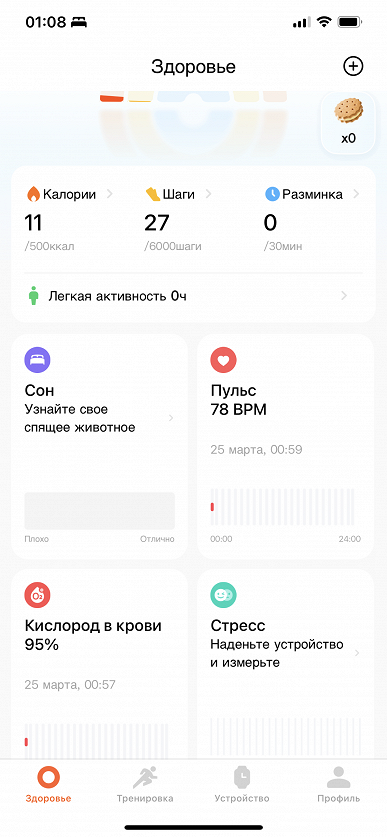 Да, здесь нет ничего такого, чего мы не видели бы прежде. Но отметим, что со всем заявленным модель справляется очень неплохо. Например, корректно отслеживает сон, весьма точно замечая момент засыпания и пробуждения (в том числе кратковременного). Не было у нас претензий также по измерению пульса и SpO2.