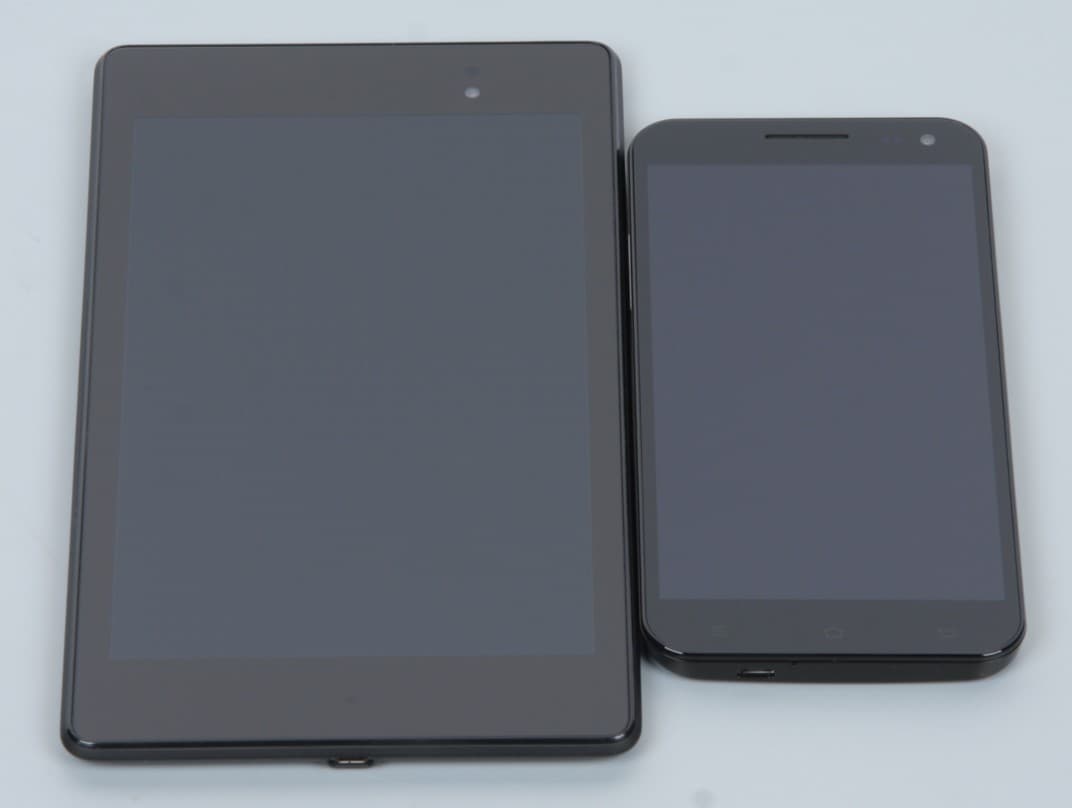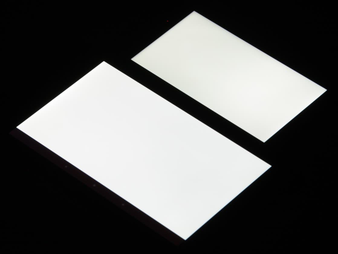 Лицевая поверхность экрана выполнена в виде стеклянной пластины с зеркально-гладкой поверхностью, устойчивой к появлению царапин. Судя по отражению объектов, имеется эффективный антибликовый фильтр, который по снижению яркости отражения не хуже, чем у Google Nexus 7 (2013) (далее просто Nexus 7). Для наглядности приведем фотографию, на которой в выключенных экранах отражается белая поверхность (слева — Nexus 7, справа — Zopo ZP998, далее их можно различать по размеру):