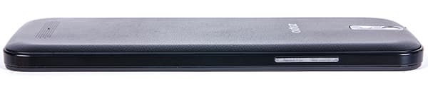 Корпус смартфона целиком выполнен из пластика — металла здесь нет. Пластик качественный и не маркий: на твердых матовых боковых поверхностях отпечатков пальцев не остается, а задняя крышка и вовсе выполнена с текстурированием «под кожу». В руках смартфон удерживается крепко и надежно за счет матовой поверхности боковин и шершавой текстурированной поверхности задней крышки. Крышка не имеет прорезиненного эффекта soft-touch, однако за счет кожаной текстуры руки совершенно не скользят по нему и также не оставляют отпечатков. Корпус отлично собран — между деталями не найти неряшливых щелей или зазоров, но к тому же, в отличие от THL T100S, он настолько крепко сбит, что при сжатиях не слышно ни малейшего скрипа или дребезжания (у THL T100S таковые наблюдались, хотя к внешней стороне сборки тоже не было никаких претензий).