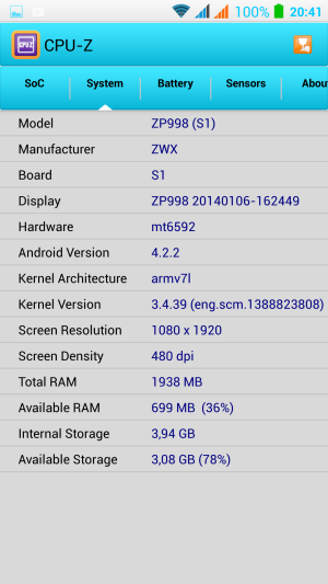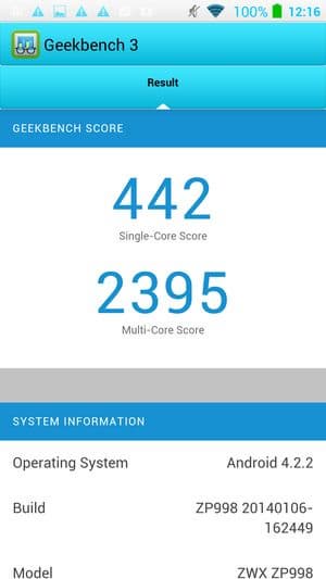 Аппаратная платформа Zopo 998 так же как и THL T100S строится на базе новой восьмиядерной однокристальной системы (SoC) MediaTek MT6592, официально представленной в конце прошлого года. Особенностью новой SoC является то, что в ее конфигурацию входит восемь полноценных процессорных ядер, [одновременно] функционирующих на частоте до 2 ГГц (в данном случае — 1,7 ГГц). (В некоторых SoC, присутствующих на рынке, тоже есть 8 ядер, но они работают по схеме 4/4.) Правда, здесь использованы всего лишь ARM Cortex-A7, то есть далеко не самые мощные ядра, так что если приложение не способно нагружать 8 ядер одновременно, то и прироста в производительности новой SoC по отношению к другим системам с меньшим количеством более быстрых ядер (Cortex-A9, Cortex-A15) ожидать нет никакого резона. Что, собственно, и было продемонстрировано нашими подопечными Zopo 998 и THL T100S во время проверки в большинстве современных тестов.