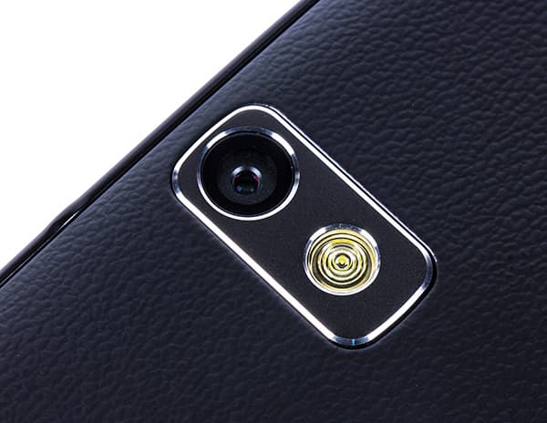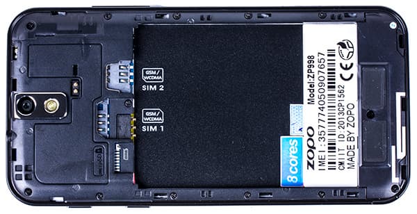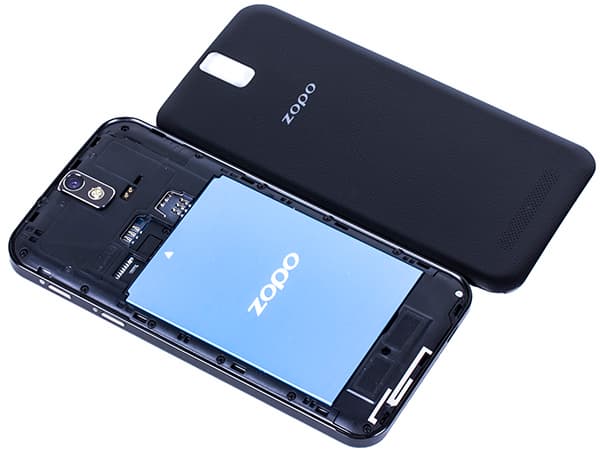Задняя крышка здесь, как и у THL T100S съемная, крепится традиционно на нескольких пластиковых защелках, отрывается от корпуса, пожалуй, чуть более тяжело, чем хотелось бы. Для поддевания ногтем в углу имееся небольшой уступ. Когда смартфон в сборе, на внешней поверхности появляется чуть выпирающая из корпуса металлическая вставка с вмонтированными в нее окошками камеры и вспышки. В отличие от THL T100S, смартфон Zopo 998 не имеет предустановленного приложения, способного заставить работать вспышку в качестве фонарика.