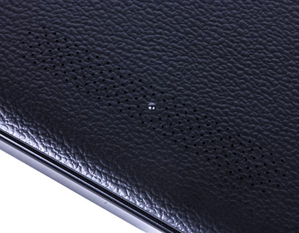Ниже обустроена решетка для выхода звука из динамика, выполненная в виде блока массы мельчайших отверстий в этой псевдокоже. Выглядит очень симпатично и достойно, а для поднятия над поверхностью стола здесь предусмотрен едва заметный пластиковый пупырышек.