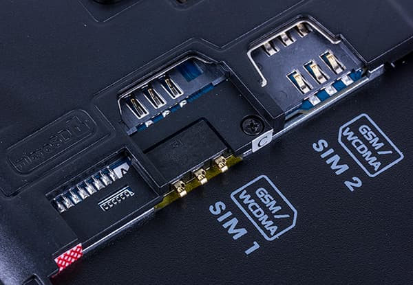 Карточки подпираются снизу аккумуляторной батареей, которую необходимо снять, чтобы получить доступ к слотам, так что горячая замена здесь невозможна. Батарея очень широкая и имеет чуть больший объем, чем у аппарата THL — 2400 мА·ч. Все слоты имеют щелевое строение и не имеют подпружиненных механизмов захвата — карточки держатся в них лишь за счет силы трения.