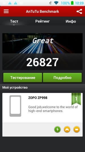 Так что в целом новая платформа показала средние или немного выше среднего результаты, если сравнивать с современными действительно топовыми платформами лидеров рынка. Опираясь на цифры популярного AnTuTu, это будет выглядеть приблизительно так: 26 тысяч баллов у восьмиядерных Zopo 998 и THL T100S против 35 тысяч у топовых смартфонов, таких как LG G2, Samsung Galaxy Note 3, Sony Xperia Z1, Acer Liquid S2 и других. Поэтому, даже несмотря на видимое маркетинговое превосходство по количеству процессорных ядер, которое на бумаге смотрится красиво, все же нет никакого смысла ставить героя сегодняшнего обзора в один ряд с лидерами рынка, пусть и с меньшим количеством ядер — он до них не дотягивает ни по одному из параметров. Впрочем, он на превосходство и не претендует, если судить по цене (оба китайских флагмана, THL T100S и Zopo ZP998, предлагаются сейчас по цене примерно в $300). Поэтому мы добавили в сравнительные таблички результаты других, более уместных в данном случае скромных китайских аппаратов, сопоставимых и по цене, и по производительности, и уже на их уровне продемонстрируем результаты тестов новинки.