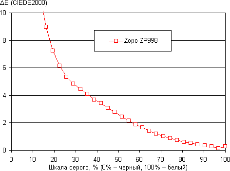 В итоге визуально цвета имеют естественную насыщенность. Баланс оттенков на шкале серого неидеален, так как цветовая температура близка к стандартным 6500 К и на белом отклонение от спектра абсолютно черного тела (ΔE) очень небольшое, однако при этом ΔE резко возрастает к темным оттенкам из-за роста доли красной и синей компонент. В итоге, чем темнее оттенок серого, тем больше в нем примеси фиолетового, и это отрицательно сказывается на визуальной оценке цветового баланса. (Самые темные области шкалы серого можно не учитывать, так как там баланс цветов не имеет большого значения, да и погрешность измерений цветовых характеристик на низкой яркости большая.)
