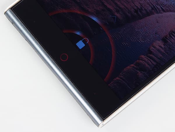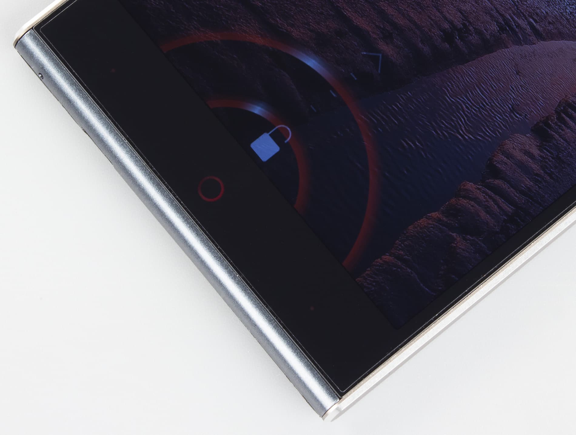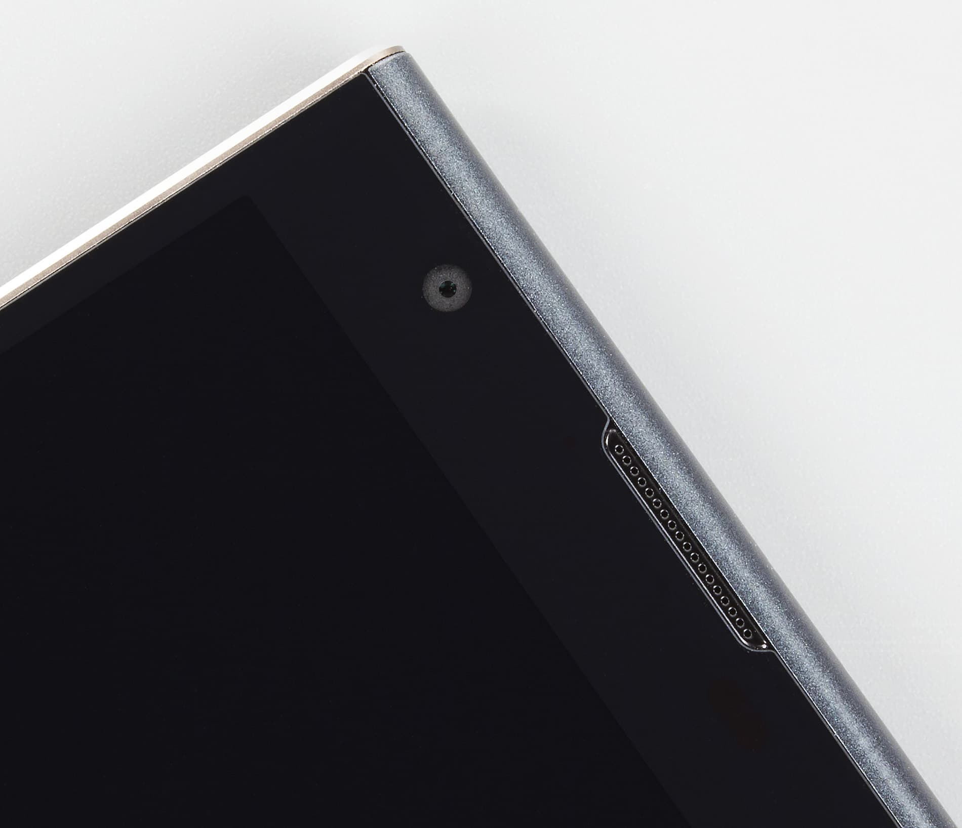 Передняя панель полностью прикрыта плоским защитным стеклом Gorilla Glass 3 без бортиков. В верхней части в стекле вырезана выемка для размещения решетки телефонного динамика, рядом с ней виднеются сенсоры и окошко фронтальной камеры.