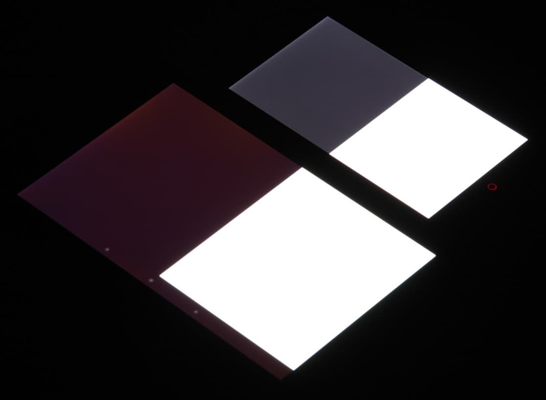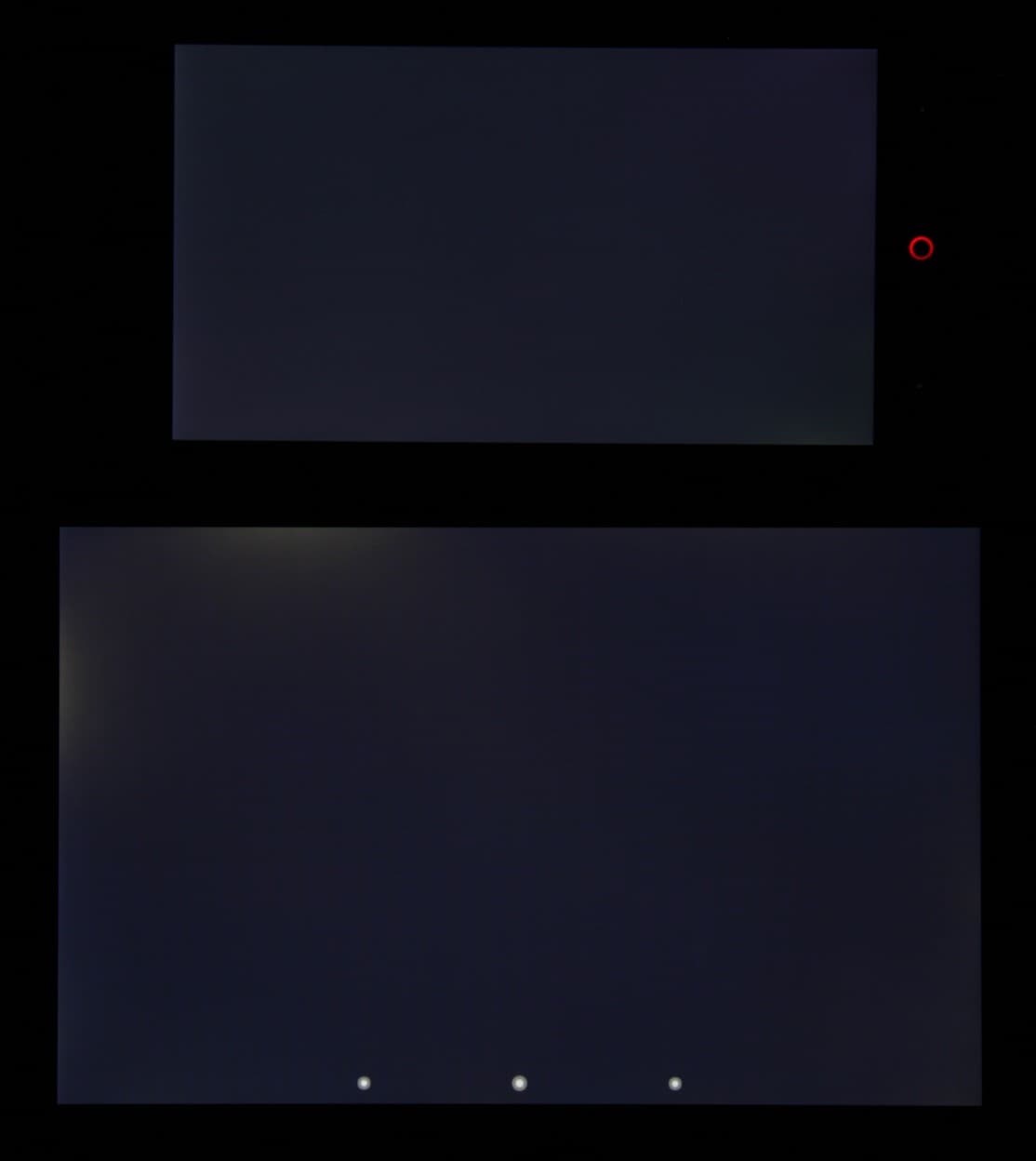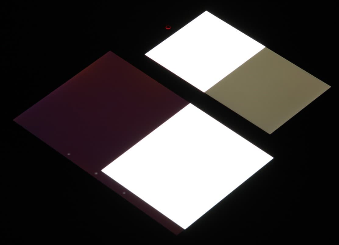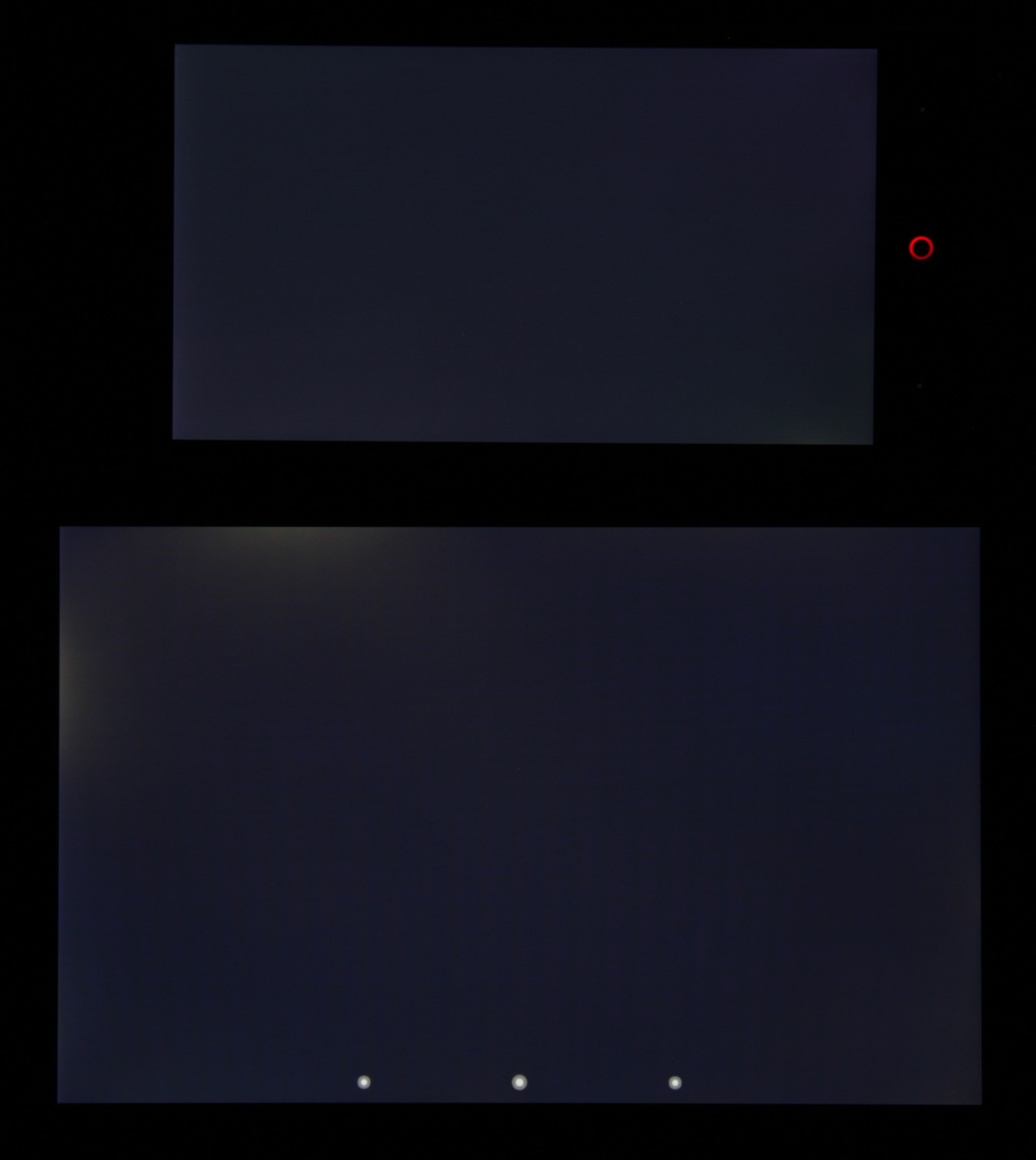 Яркость под углом у экранов уменьшилась (как минимум в 5 раз, исходя из разницы в выдержке), но у Zopo ZP920 экран немного темнее (яркость по фотографиям 216 против 229 у Nexus 7). Черное поле при отклонении по диагонали высветляется сильно и приобретает желтоватый или фиолетовый оттенок. Фотографии ниже это демонстрируют (яркость белых участков в перпендикулярном плоскости экранов направлении одинаковая!):