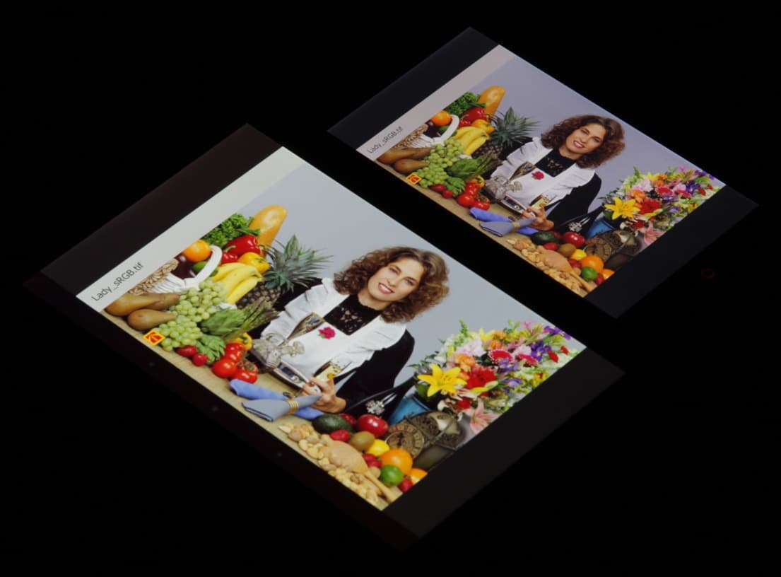 Экран имеет хорошие углы обзора без значительного сдвига цветов даже при больших отклонениях взгляда от перпендикуляра к экрану и без инвертирования оттенков. Для сравнения приведем фотографии, на которых на экраны Zopo ZP920 и Nexus 7 выведены одинаковые изображения, при этом яркость экранов изначально установлена примерно на 200 кд/м², а цветовой баланс на фотоаппарате принудительно переключен на 6500 К. Перпендикулярно к экранам белое поле: