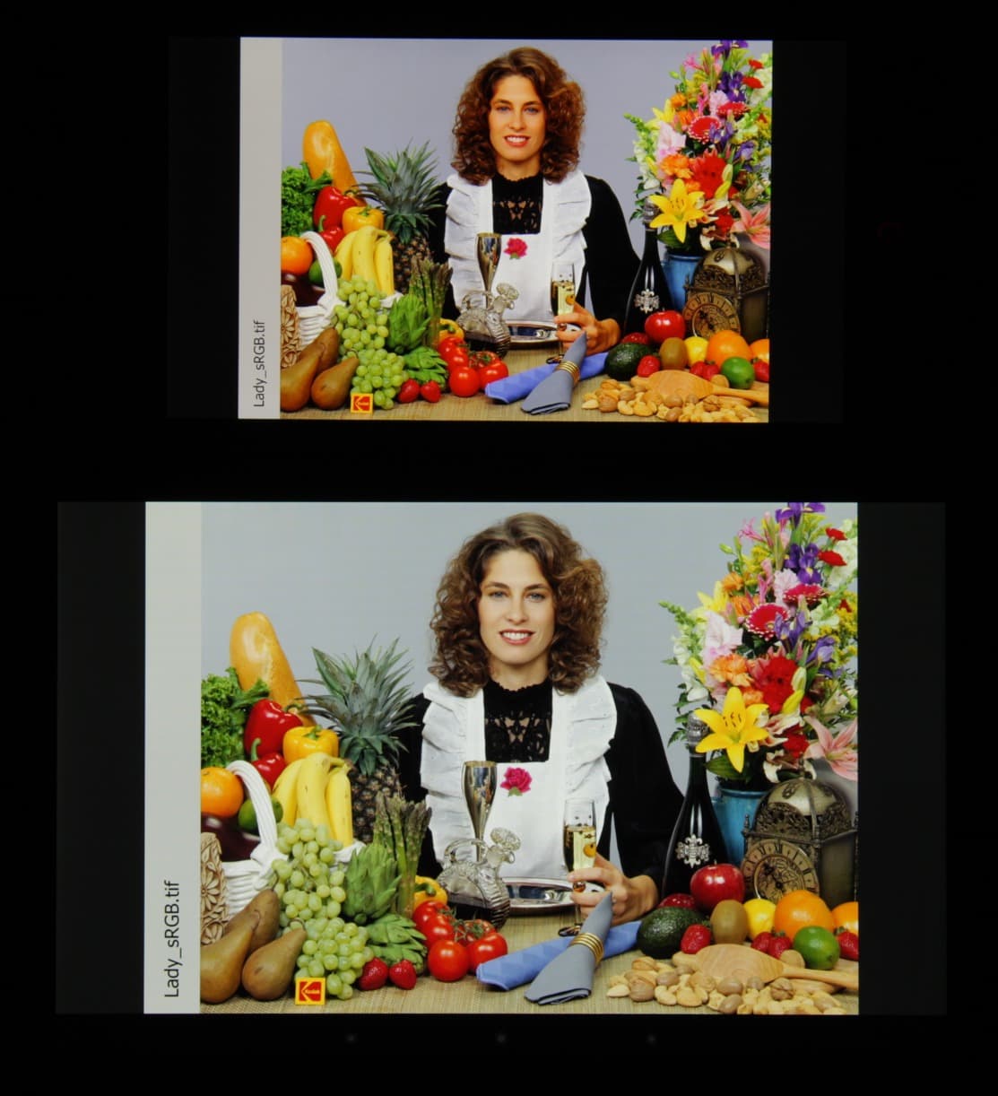 В итоге цвета могли бы иметь естественную насыщенность, но по умолчанию цветовой контраст немного повышается, что и демонстрирует приведенная выше фотография с тестовым изображением. Баланс оттенков на шкале серого слегка компромиссный, так как цветовая температура не сильно выше стандартных 6500 К, а отклонение от спектра абсолютно черного тела (ΔE) меньше 10, что для потребительского устройства считается приемлемым показателем. При этом цветовая температура мало изменяются от оттенка к оттенку — это положительно сказывается на визуальной оценке цветового баланса, однако изменение ΔE уже великовато, что плохо. (Самые темные области шкалы серого можно не учитывать, так как там баланс цветов не имеет большого значения, да и погрешность измерений цветовых характеристик на низкой яркости большая.)