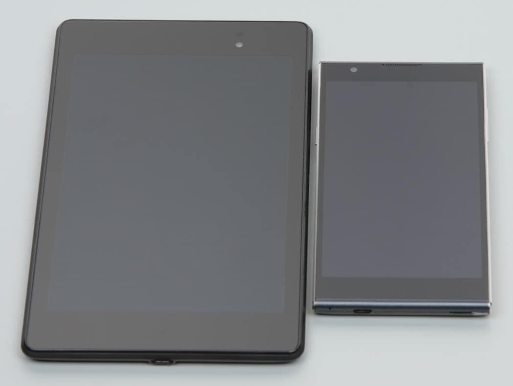 Лицевая поверхность экрана выполнена в виде стеклянной пластины с зеркально-гладкой поверхностью, устойчивой к появлению царапин. Судя по отражению объектов антибликовые свойства экрана не хуже, чем у экрана Google Nexus 7 (2013) (далее просто Nexus 7). Для наглядности приведем фотографию, на которой в выключенных экранах отражается белая поверхность (слева — Nexus 7, справа — Zopo ZP920, далее их можно различать по размеру):
