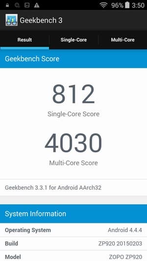 Zopo ZP920 работает в данный момент на программной платформе Google Android версии 4.4.4. Производитель не устанавливал никаких альтернативных оболочек, так что организация всех меню, рабочих столов и функциональность панели уведомлений с меню быстрых настроек здесь точно такие же, как в «стоковой» Google Android ОС. На фирменный интерфейс ОС Android производитель смартфона практически никак не повлиял. Добавлена лишь поддержка управления жестами: например, можно, не прикасаясь к экрану, перелистывать изображения, просматривать страницы в браузере, переключать треки в плеере и т. п.