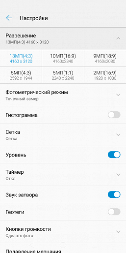 Есть несколько специальных режимов: ручной, ретушь, монохромный; есть даже встроенная возможность создания коллажей. Меню настроек наглядное и интуитивно понятное: можно отключить звук затвора, вывести на экран сетку, уровень и даже гистограмму, есть функция подавления мерцания. Поддерживается автоматический режим HDR. В RAW снимки штатно сохранять нельзя.