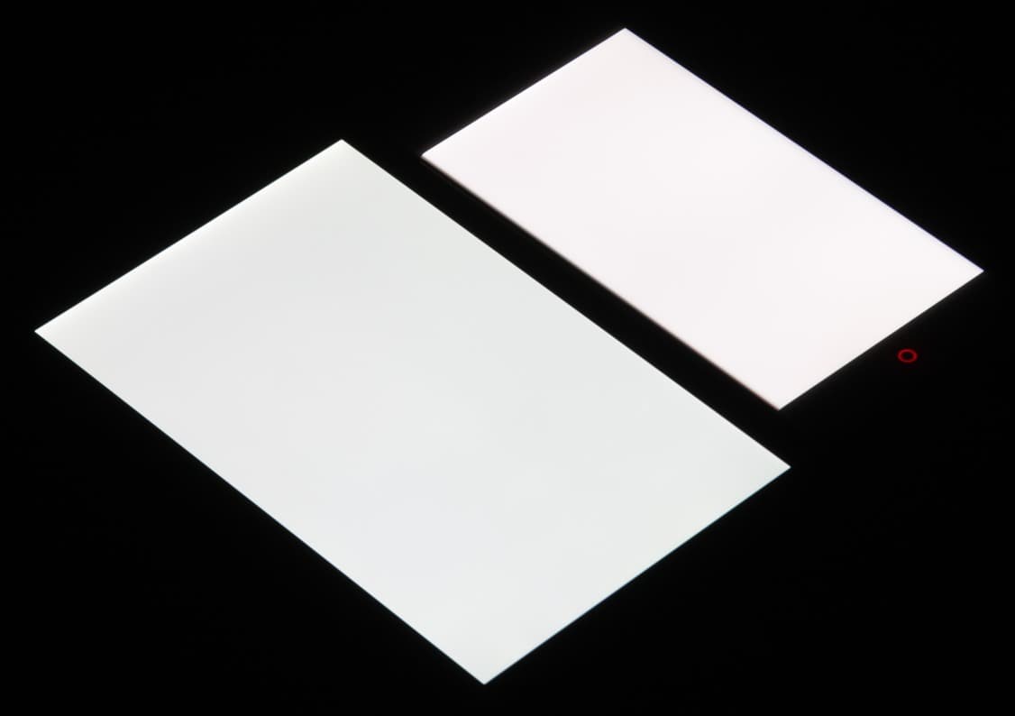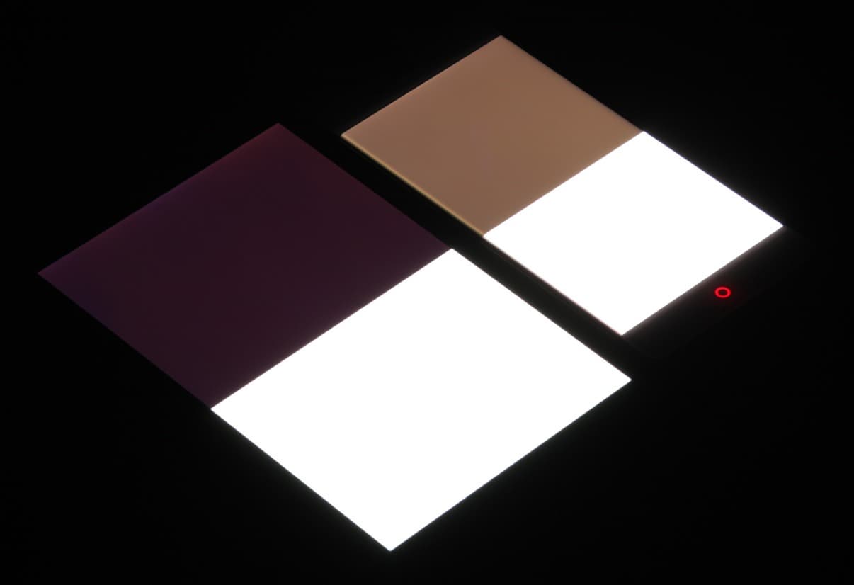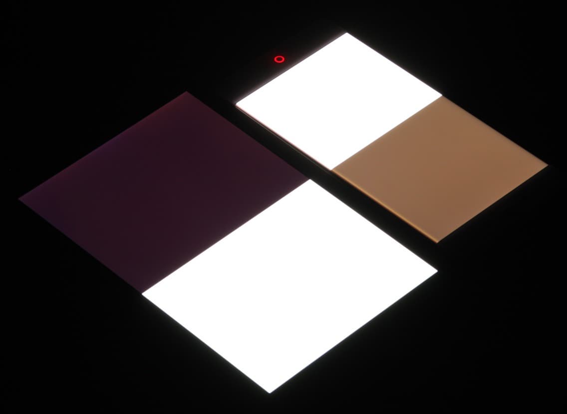 Яркость под углом у экранов уменьшилась (как минимум в 4 раза, исходя из разницы в выдержке), но у ZTE Nubia Z11 экран все же светлее (яркость по фотографиям 244 против 234 у Nexus 7). Черное поле при отклонении по диагонали высветляется сильно и приобретает красноватый оттенок. Фотографии ниже это демонстрируют (яркость белых участков в перпендикулярном плоскости экранов направлении одинаковая!):
