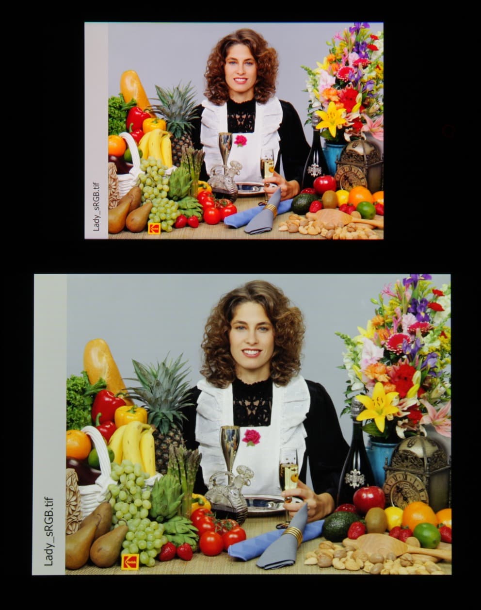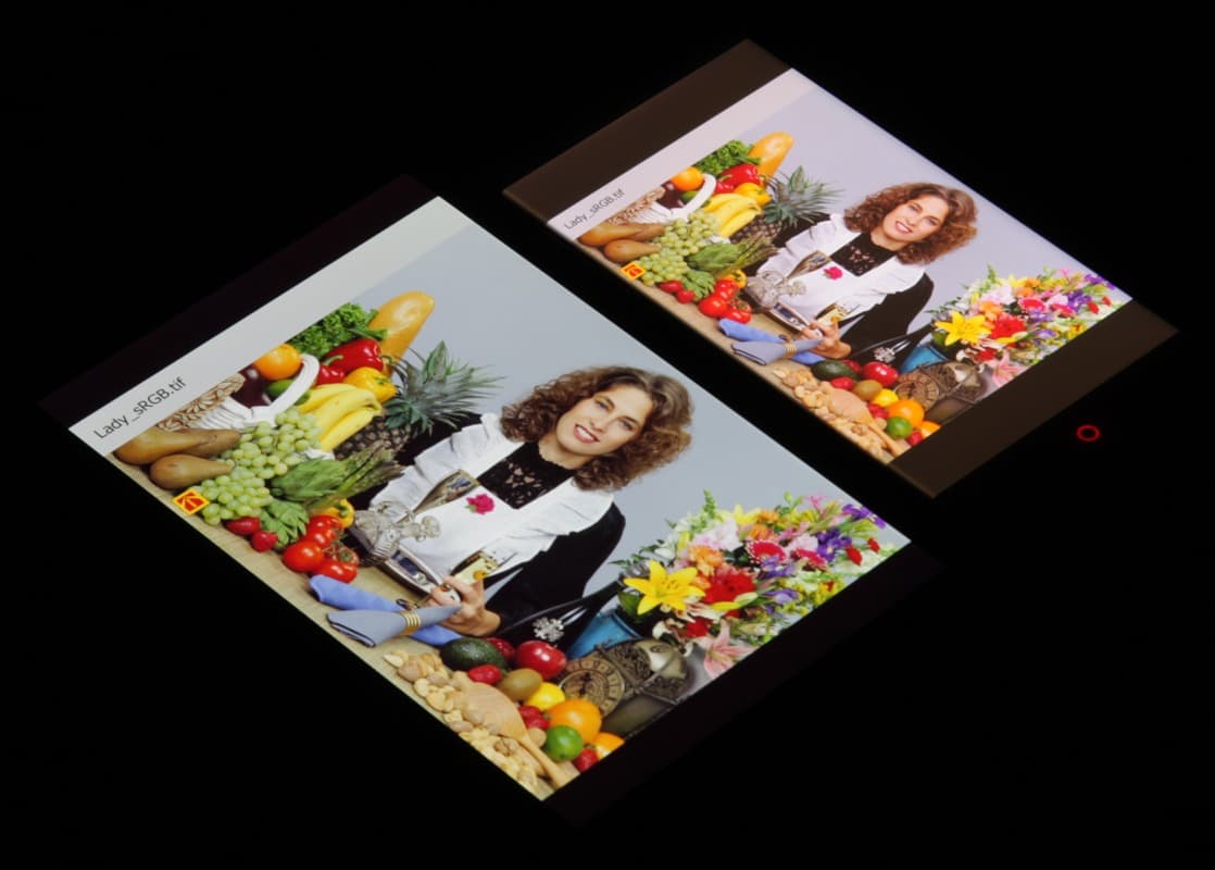 Такие спектры мы уже видели в случае, например, Sony Xperia Z2 и других мобильных устройств. Sony указывает, что в этих экранах используются светодиоды с синим излучателем и зеленым и красным люминофором (обычно — синий излучатель и желтый люминофор), что в сочетании со специальными светофильтрами матрицы и позволяет получить широкий цветовой охват. Да, и в красном люминофоре, видимо, используются так называемые квантовые точки. Для потребительского устройства широкий цветовой охват является никак не достоинством, а существенным недостатком, так как в итоге цвета изображений — рисунков, фотографий и фильмов, — ориентированных на пространство sRGB (а таких подавляющее большинство), имеют неестественную насыщенность. Особенно это заметно на узнаваемых оттенках, например на оттенках кожи. Результат приведен на фотографии выше.
