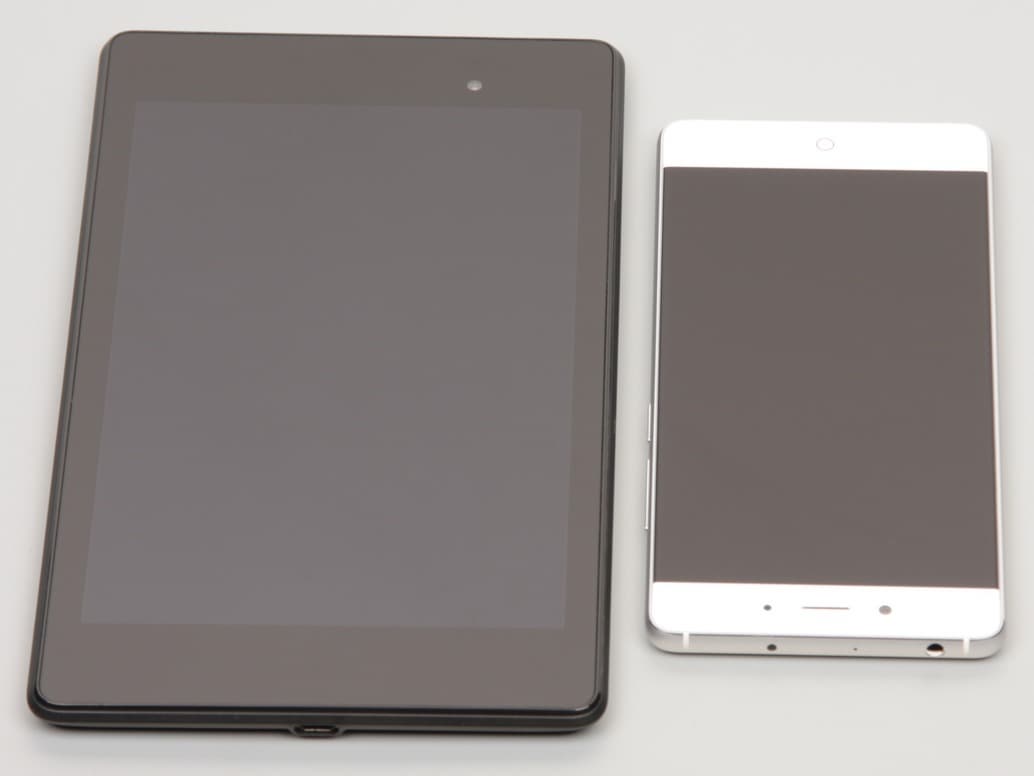 Лицевая поверхность экрана выполнена в виде стеклянной пластины с зеркально-гладкой поверхностью, устойчивой к появлению царапин. Судя по отражению объектов антибликовые свойства экрана лучше, чем у экрана Google Nexus 7 (2013) (далее просто Nexus 7). Для наглядности приведем фотографию, на которой в выключенных экранах отражается белая поверхность (слева — Nexus 7, справа — ZTE Nubia Z11, далее их можно различать по размеру):