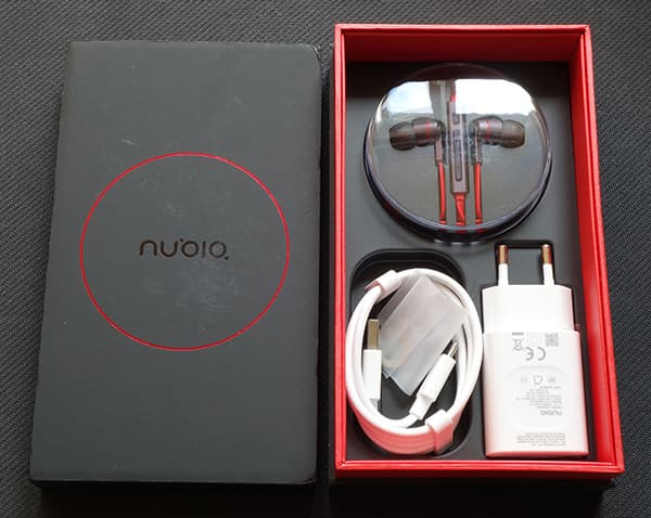 Nubia Z11 поступает в продажу в плоской стильно оформленной коробке прямоугольной формы. Упаковка выполнена из матового черного картона с красными элементами, это сочетание смотрится максимально выигрышно в случае с продуктом премиального класса.