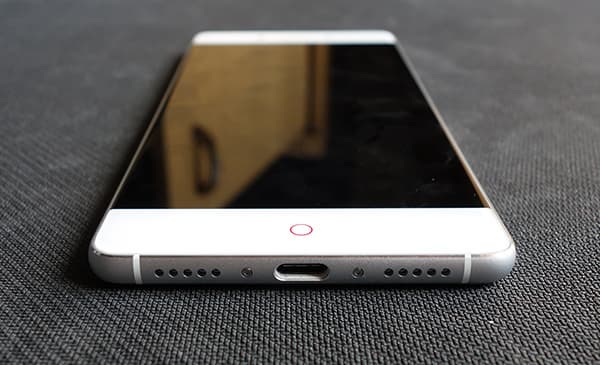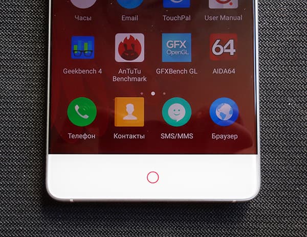 Передняя панель прикрыта 2.5D-стеклом Gorilla Glass 3 с покатыми краями, под стеклом расположился привычный набор элементов: датчики, фронтальная камера и светодиодный индикатор событий, в виде «дышащего» кружка с красной подсветкой под экраном — это фирменный элемент оформления всех смартфонов Nubia. Две сенсорные кнопки по бокам от кружка также имеют подсвечивающиеся пиктограммы в виде обычных точек, поэтому назначение кнопок можно поменять на свой вкус.