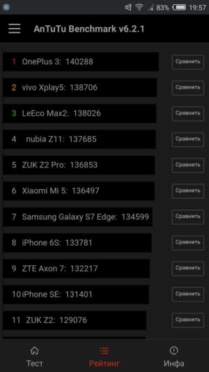 | Nubia Z11 (Qualcomm Snapdragon 820) | Meizu Pro 6 (MT6797T) | Huawei P9 (HiSilicon Kirin 955) | Samsung Galaxy S7 Edge (Samsung Exynos 8890 Octa) | Moto X Force (Qualcomm Snapdragon 810) | |