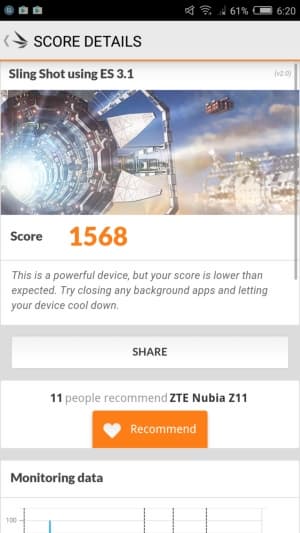 Экран у ZTE Nubia Z11 темнее (яркость по фотографиям 103 против 116 у Nexus 7). Двоение отраженных объектов в экране ZTE Nubia Z11 очень слабое, это свидетельствует о том, что между слоями экрана (конкретнее между внешним стеклом и поверхностью ЖК-матрицы) нет воздушного промежутка (экран типа OGS — One Glass Solution). За счет меньшего числа границ (типа стекло/воздух) с сильно различающимися коэффициентами преломления такие экраны лучше смотрятся в условиях интенсивной внешней засветки, но вот их ремонт в случае потрескавшегося внешнего стекла обходится гораздо дороже, так как менять приходится экран целиком. На внешней поверхности экрана есть специальное олеофобное (жироотталкивающее) покрытие (по эффективности даже лучше, чем у Nexus 7), поэтому следы от пальцев удаляются значительно легче, а появляются с меньшей скоростью, чем в случае обычного стекла.