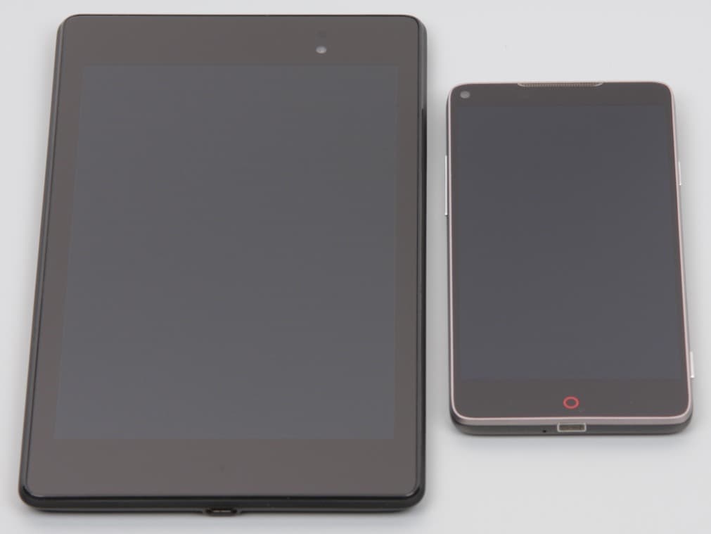 Лицевая поверхность экрана выполнена в виде стеклянной пластины с зеркально-гладкой поверхностью, устойчивой к появлению царапин. Судя по отражению объектов, имеется эффективный антибликовый фильтр, который по снижению яркости отражения лучше, чем у Google Nexus 7 (2013) (далее просто Nexus 7). Для наглядности приведем фотографию, на которой в выключенных экранах отражается белая поверхность (слева — Nexus 7, справа — ZTE nubia Z5s, далее их можно различать по размеру):
