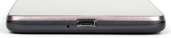 Разъем Micro-USB, расположенный на нижнем торце, поддерживает работу лишь в режиме USB 2.0, но имеется возможность подключения внешних устройств (USB OTG). Рядом с разъемом виднеется отверстие разговорного микрофона, еще два дополнительных микрофона, служащие для шумоподавления, размещены в верхней части корпуса. Никакими заглушками разъемы ZTE nubia Z5s не снабжены, смартфон не имеет защиты от воды и грязи. Крепления для ремешка на корпусе аппарата также не нашлось.