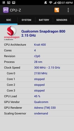 - SoC Qualcomm Snapdragon 800 (MSM8974), 4 ядра Krait 400, 2,15 ГГц