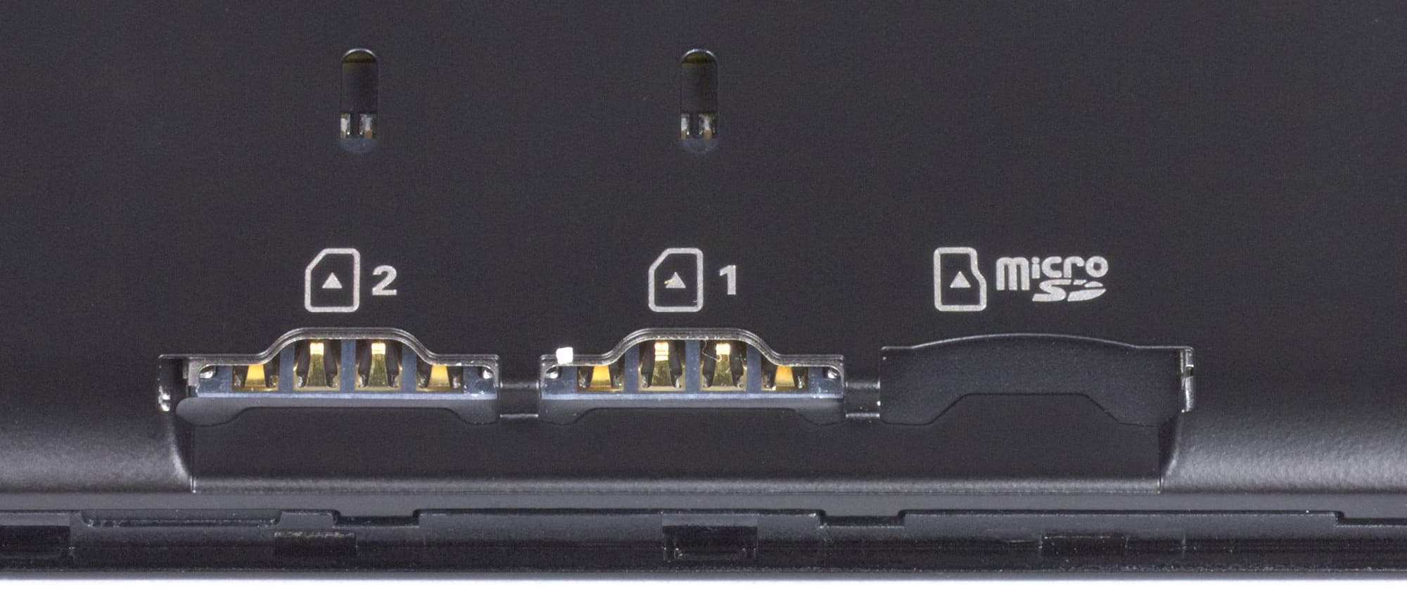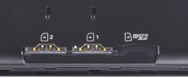 Под крышкой скрываются два слота для карточек Micro-SIM, а также слот для карты памяти microSD, поддерживающий установку карт объемом до 64 ГБ. SIM-карты достаточно плотно входят в свои слоты, застрявшую карточку можно подтолкнуть острым предметом сквозь специальные прорези, однако использовать карточки с переходниками в таких слотах неудобно. Раз на раз не приходится, но однажды наш переходник с Nano-SIM на Micro-SIM застрял в одном из слотов настолько плотно, что пришлось прибегать к помощи пинцета.