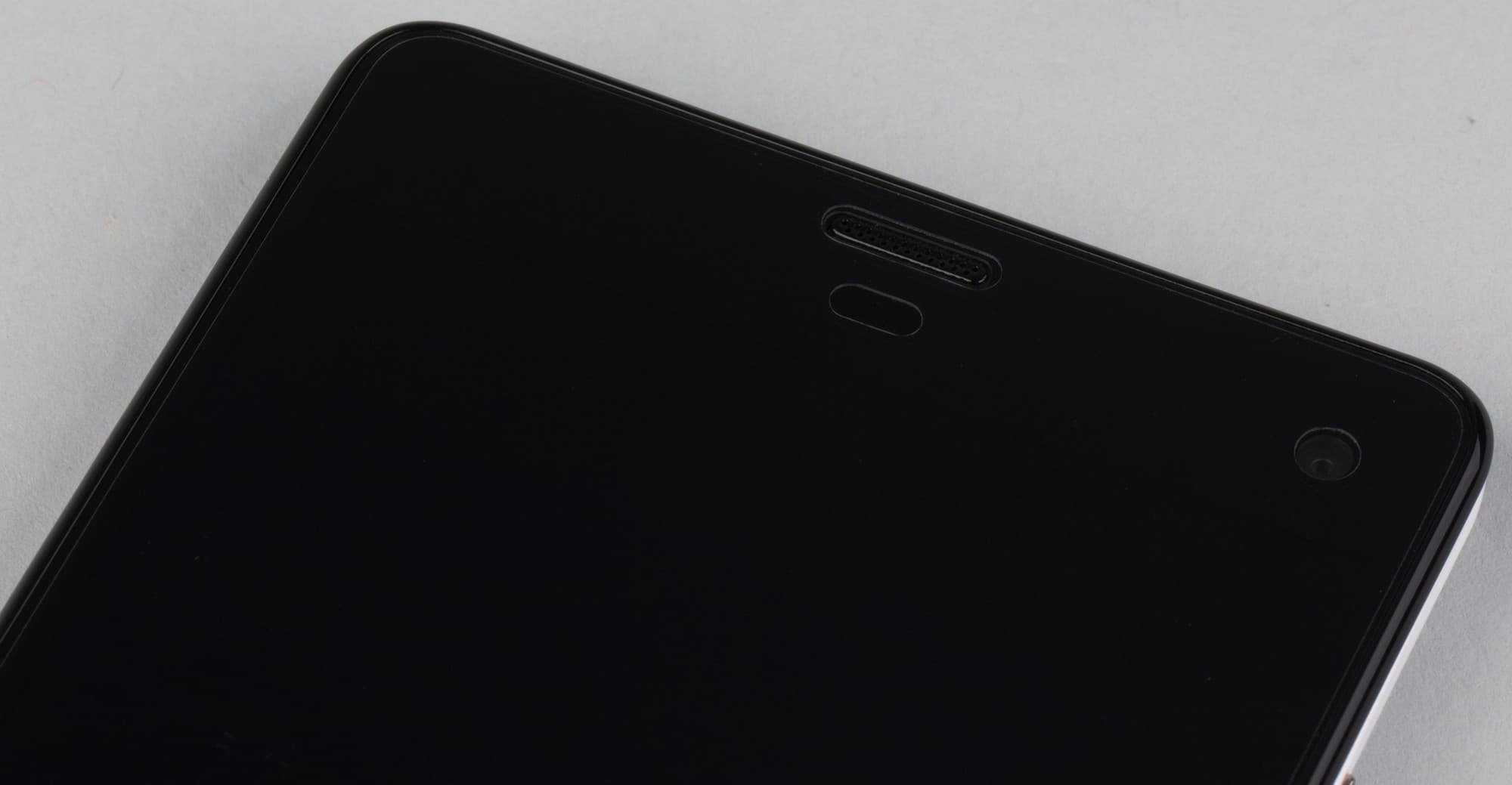 Передняя поверхность полностью прикрыта плоским защитным стеклом Gorilla Glass 3. Окошко фронтальной камеры и глазки сенсоров спрятаны под стеклом в верхней части над экраном, рядом с решеткой разговорного динамика.