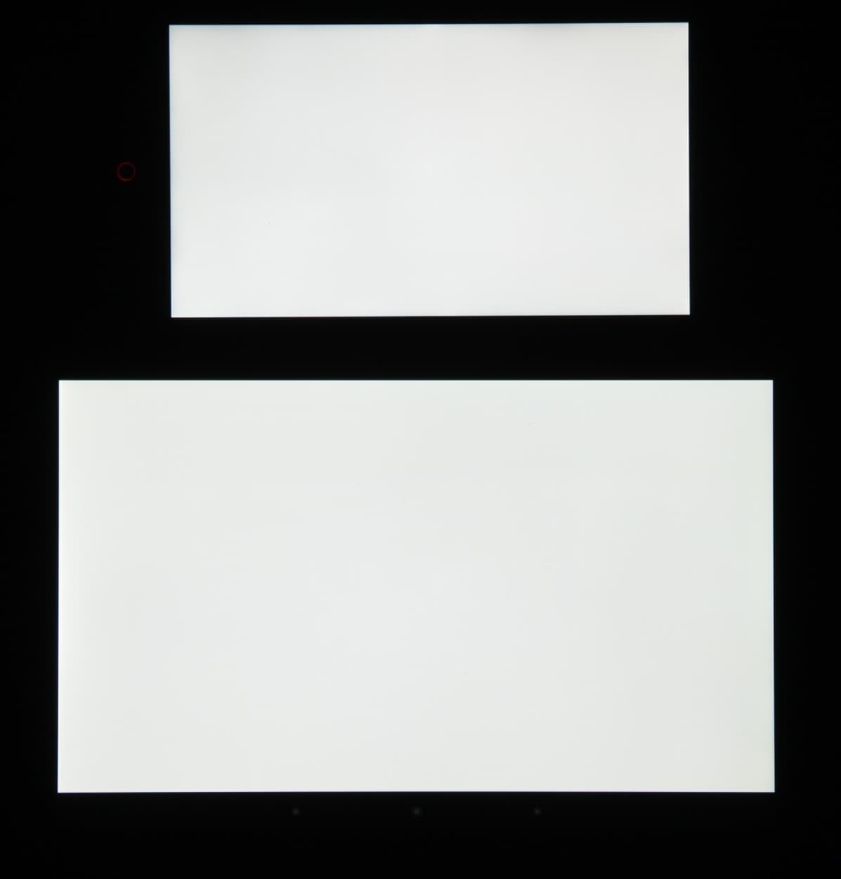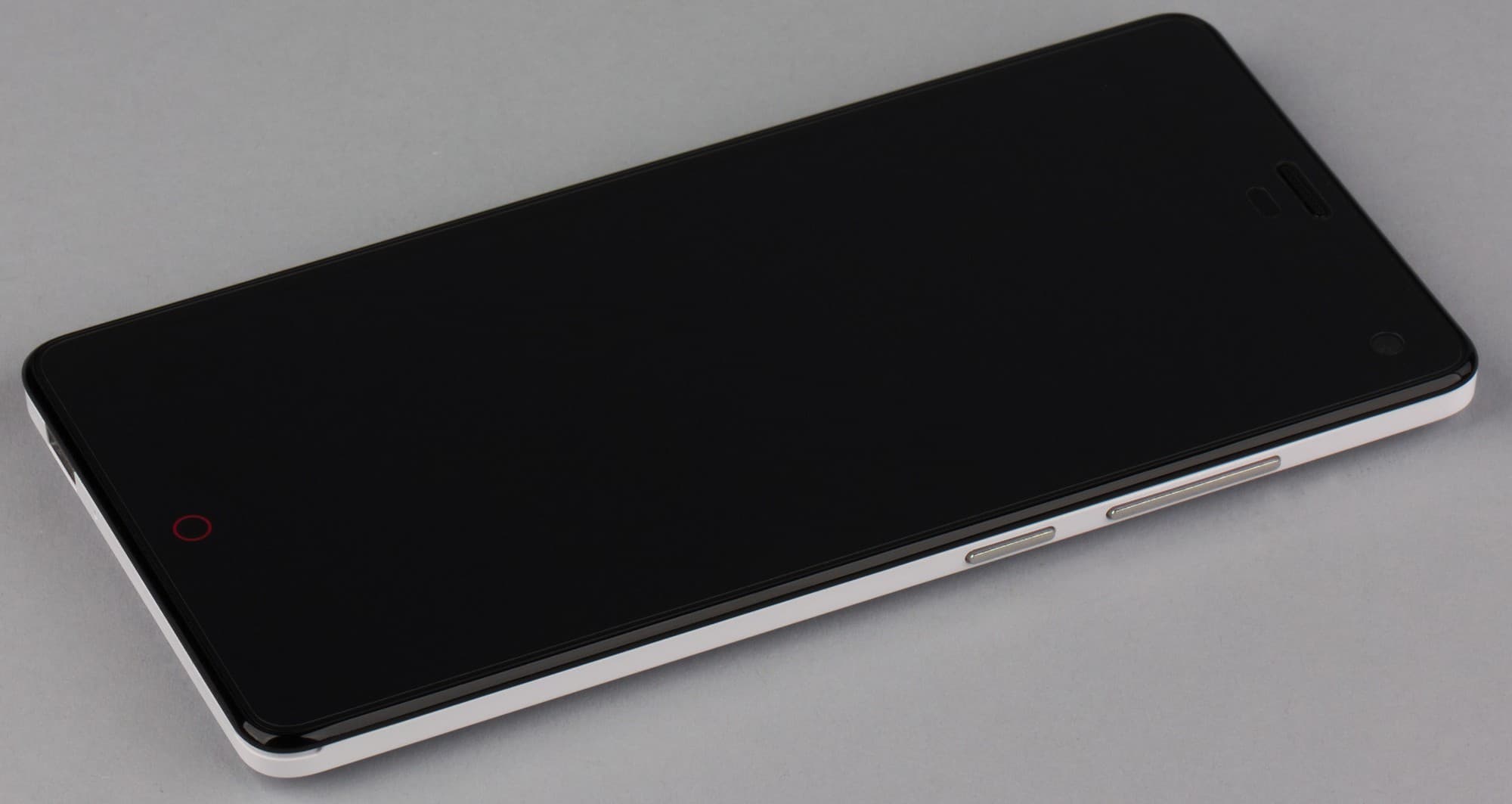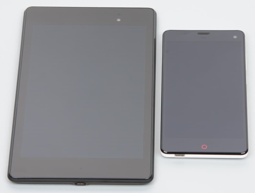 На экран этого смартфона изначально и, скорее всего, фабричным способом была наклеена защитная пленка, которую мы удалили. Лицевая поверхность экрана выполнена в виде стеклянной пластины с зеркально-гладкой поверхностью, устойчивой к появлению царапин. Судя по отражению объектов антибликовые свойства экрана не хуже, чем у экрана Google Nexus 7 (2013) (далее просто Nexus 7). Для наглядности приведем фотографию, на которой в выключенных экранах отражается белая поверхность (слева — Nexus 7, справа — ZTE nubia Z7 mini, далее их можно различать по размеру):
