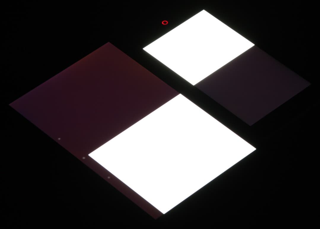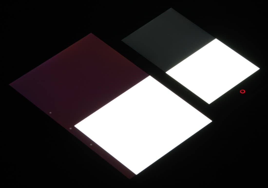 Яркость под углом у экранов уменьшилась (как минимум в 4 раза, исходя из разницы в выдержке), но в случае ZTE nubia Z7 mini падение яркости меньше. Черное поле при отклонении по диагонали высветляется слабо и приобретает красно-фиолетовый оттенок или остается почти нейтрально-серым. Фотографии ниже это демонстрируют (яркость белых участков в перпендикулярном плоскости экранов направлении примерно одинаковая!):