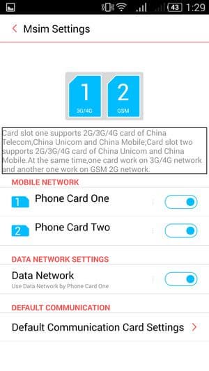 Смартфон поддерживает работу с двумя SIM-картами, и в целом работа с ними в меню организована по знакомому принципу: можно любую из SIM-карт назначить основной для организации голосовых звонков, передачи данных или отправки SMS-сообщений; при наборе номера также можно выбрать желаемую карту прямо в телефонном интерфейсе. С сетями 3G/4G может работать SIM-карта в любом слоте, однако одновременно в этом режиме может функционировать лишь одна из карт. Для смены назначений слотов карточки менять местами не требуется — это можно сделать прямо из меню телефона.