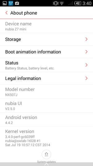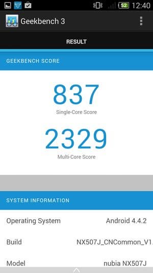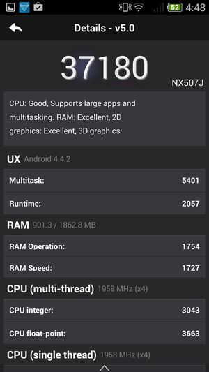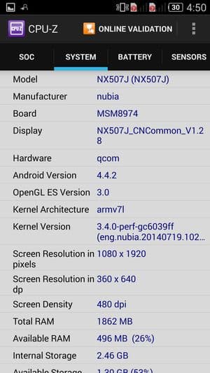 Аппаратная платформа ZTE nubia Z7 mini строится на базе новейшей однокристальной четырехъядерной системы (SoC) Qualcomm Snapdragon 801 с четырьмя ядрами Krait 400. Напомним, что новая платформа обладает функциональностью Snapdragon 800 с чуть большей частотой процессорных ядер: Snapdragon 801 может работать на частотах до 2,5 ГГц, в то время как частота ядер предыдущей версии чипа была ограничена на уровне 2,3 ГГц. Правда, у большинства новых флагманов, в том числе и героя сегодняшнего обзора, максимальная частота процессорных ядер чаще всего все равно оказывается ограничена более низкими величинами (в данном случае — 2,0 ГГц). В представленной модели используется платформа MSM8974AА, которая, судя по табличке со спецификациями, обладает еще и урезанной рабочей частотой графического процессора Adreno 330 (Max GPU Frequency составляет 450 МГц).