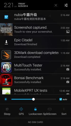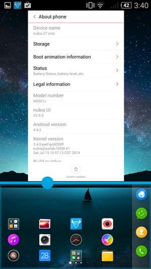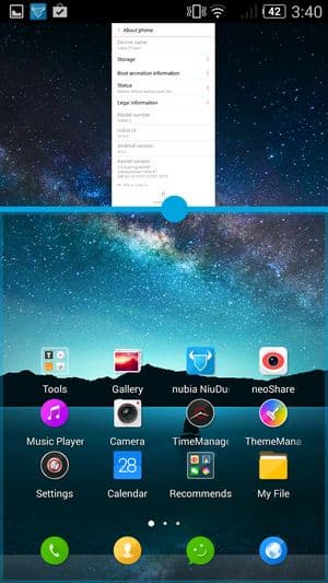 В качестве системы используется программная платформа Google Android версии 4.4.2 и фирменный графический пользовательский интерфейс Nubia UI 2.0. Оболочка практически точно такая же, как у протестированных нами ранее других моделей серии nubia. Наиболее заметная черта оболочки — отсутствие отдельного меню приложений. Иконки устанавливаемых программ автоматически раскладываются прямо на рабочие столы, причем вперемешку с виджетами. Естественно, не только поддерживается создание папок/групп, но и часть предустановленных приложений уже разложена по тематическим папкам самими разработчиками. Поддерживается широкая работа с жестами, их в меню очень много, они объединены в несколько разделов, и по каждому есть наглядная инструкция.
