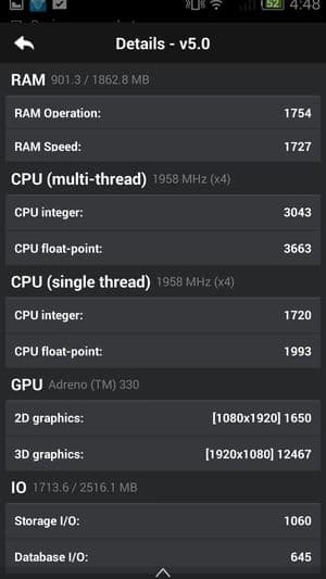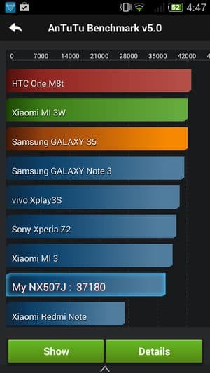 По результатам тестирования в бенчмарках аппарат показал себя одним из самых мощных и производительных современных мобильных аппаратов на рынке. В тесте AnTuTu испытуемый показал даже более высокие результаты, чем такие общепризнанные мировые лидеры, Samsung Galaxy S5, Sony Xperia Z2 и HTC One. Однако не совсем пока понятно, как результаты двух версий популярного бенчмарка коррелируют между собой, ведь теперь на смену четвертой версии пришла пятая, и все новые аппараты отныне тестируются в ней. Привели ли разработчики все к общему знаменателю, неизвестно, так что пока придется помечать в табличках, в какой версии бенчмарка тестировалась та или иная модель. Впрочем, разница между конкурентами на Snapdragon 801 наверняка не столь уж велика, все топовые смартфоны, работа которых основана на этой SoC, в любом случае являются наиболее мощными на сегодняшний день мобильными аппаратами на рынке, производительности которых еще долго будет хватать для выполнения любых поставленных задач.