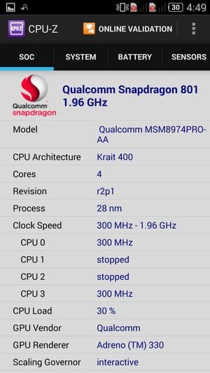- SoC Qualcomm Snapdragon 801 (MSM8974АА), 4 ядра Krait 400, 2,0 ГГц