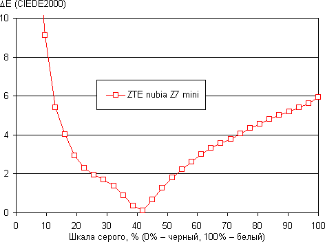 В итоге визуально цвета имеют естественную насыщенность. Баланс оттенков на шкале серого слегка компромиссный, так как цветовая температура заметно выше стандартных 6500 К. Отклонение от спектра абсолютно черного тела (ΔE) на большей части шкалы серого меньше 10, что для потребительского устройства считается хорошим показателем, но при этом ΔE сильно изменяется от оттенка к оттенку — это отрицательно сказывается на визуальной оценке цветового баланса. (Самые темные области шкалы серого можно не учитывать, так как там баланс цветов не имеет большого значения, да и погрешность измерений цветовых характеристик на низкой яркости большая.)