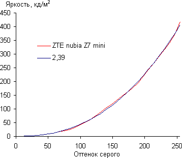 Контрастность (примерно в центре экрана) нормальная — порядка 740:1. Время отклика при переходе черный-белый-черный равно 19 мс (11 мс вкл. + 8 мс выкл.). Переход между полутонами серого 25% и 75% (по численному значению цвета) и обратно в сумме занимает 29 мс. Построенная по 32 точкам с равным интервалом по численному значению оттенка серого гамма-кривая не выявила завала ни в светах, ни в тенях. Показатель аппроксимирующей степенной функции равен 2,39, что выше стандартного значения 2,2. При этом реальная гамма-кривая несколько отклоняется от степенной зависимости: